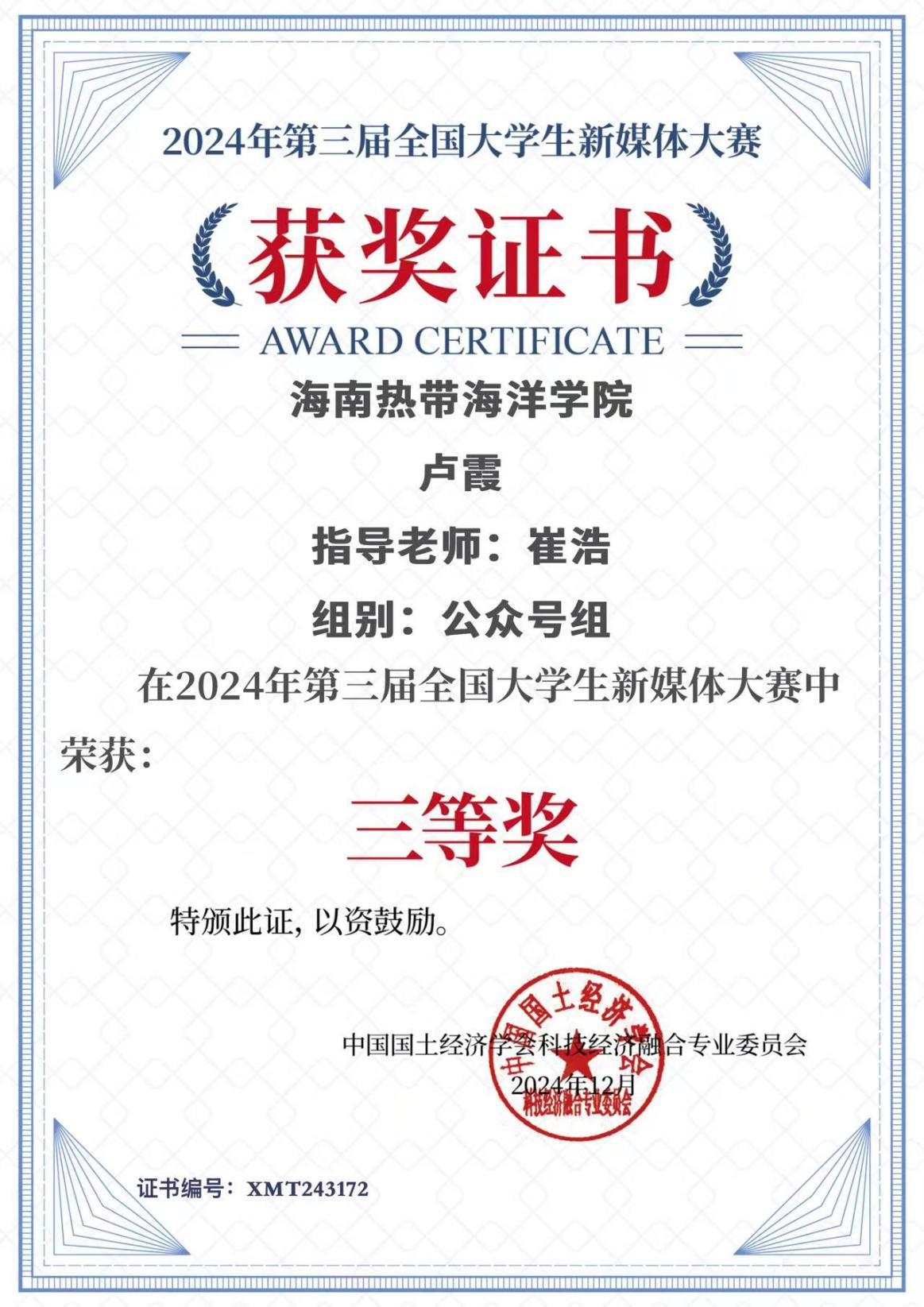 近日,由中国国土经济学会主办的2024年第三届全国大学生新媒体大赛圆满落幕。今年会官网卢霞同学凭借其作品“校园定格——你闯入镜头,我按下永远”荣获公众号组三等奖,为学院赢得了荣誉。此次大赛旨在挖掘和培养新媒体领域的创新人才,吸引了全国范围内众多高校学生的积极参与。