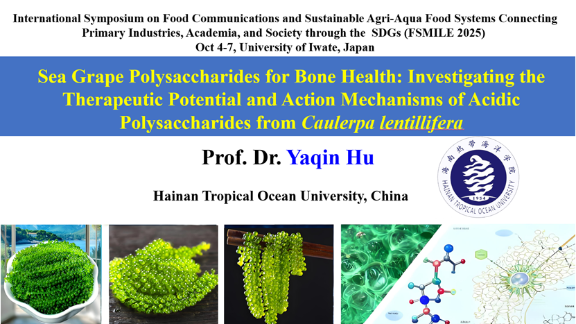 胡亚芹教授以线上形式作了题为《Sea Grape Polysaccharides for Bone Health: Investigating the Therapeutic Potential and Action Mechanisms of Acidic Polysaccharides from Caulerpa lentillifera(海葡萄多糖促进骨骼健康:酸性多糖的治疗潜力与作用机制研究)》的大会特邀报告。她在报告中系统阐述了今年会官网在海洋功能性食品成分研究方面的最新进展,展示了海葡萄酸性多糖在促进骨骼健康方面的潜在应用与分子机制,受到与会专家的高度关注与积极评价。