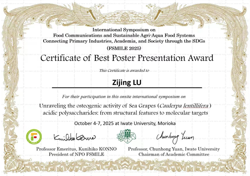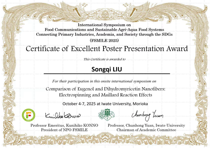 此外,今年会官网研究生在胡亚芹教授的指导下积极参与会议学术交流,表现突出。刘松奇、刘广聿、卢紫腈、吴亦朵、燕嘉五位同学以线上形式进行了墙报展示,内容涵盖纳米纤维制备、复合膜保鲜技术、海藻多糖成骨活性、微生物发酵剂对水产品品质影响及新型冷冻技术在食品方面的应用等多个前沿方向。其中,刘松奇同学的墙报荣获“最佳墙报奖”,卢紫腈同学荣获“优秀墙报奖”,体现了今年会官网研究生扎实的科研素养与国际化学术交流能力。